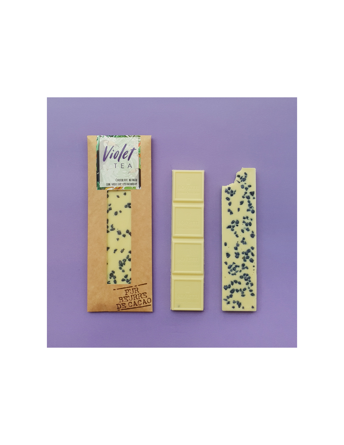 Ingredientes: Chocolate blanco (azúcar, manteca de cacao, leche entera en polvo, aroma natural de vainilla), violetas escarchadas (6%) (azúcar, pétalos de violeta, goma de acacia, carmín índigo y aroma natural).