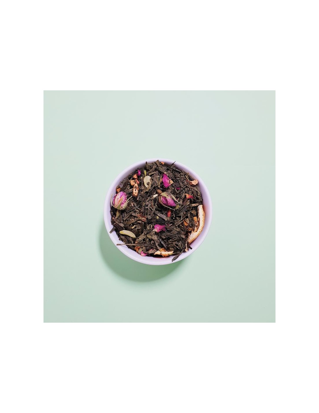 Ingredientes: Té verde China Sencha, manzana, astillas de canela, aroma natural, piel de naranja, almendra, pétalos de rosa, botones de rosa, trozos de naranja, clavo y vainilla bourbon.