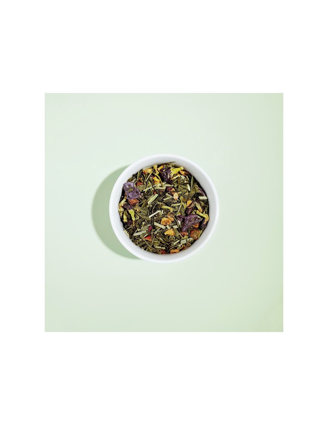 Té verde, cubitos de pitahaya rosa (pitahaya, harina de arroz), manzana ácida (manzana, acidulante: ácido cítrico), manzana, citronela, cubitos de pomelo (cáscara de pomelo, azúcar, acidulante: ácido cítrico), aroma natural de violetas, violetas escarchadas (azúcar, agente de recubrimiento (goma arábica), flores naturales de violeta, aroma natural de violetas, colorante (E120, E132)), hojas de zarzamora, cáscara de limón.