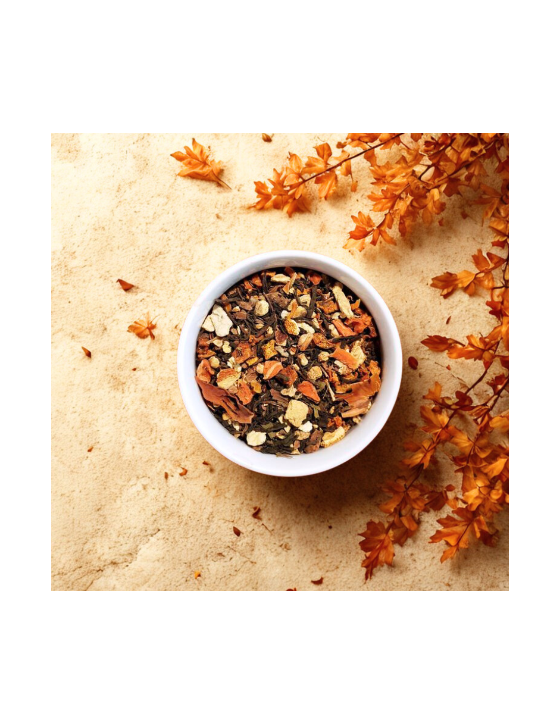 Té Pu Erh, jengibre, canela, aroma natural, cáscara de naranja, hojas de zarzamora, zanahoria, calabaza, cáscara de nuez moscada (macis), y cáscara de limón.