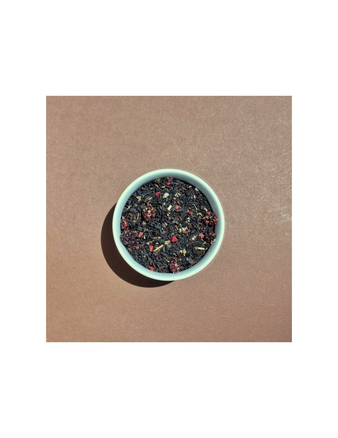 Té negro, aroma natural, bayas de saúco, mora liofilizada, hojas de frambuesa, trocitos de frambuesa liofilizada.